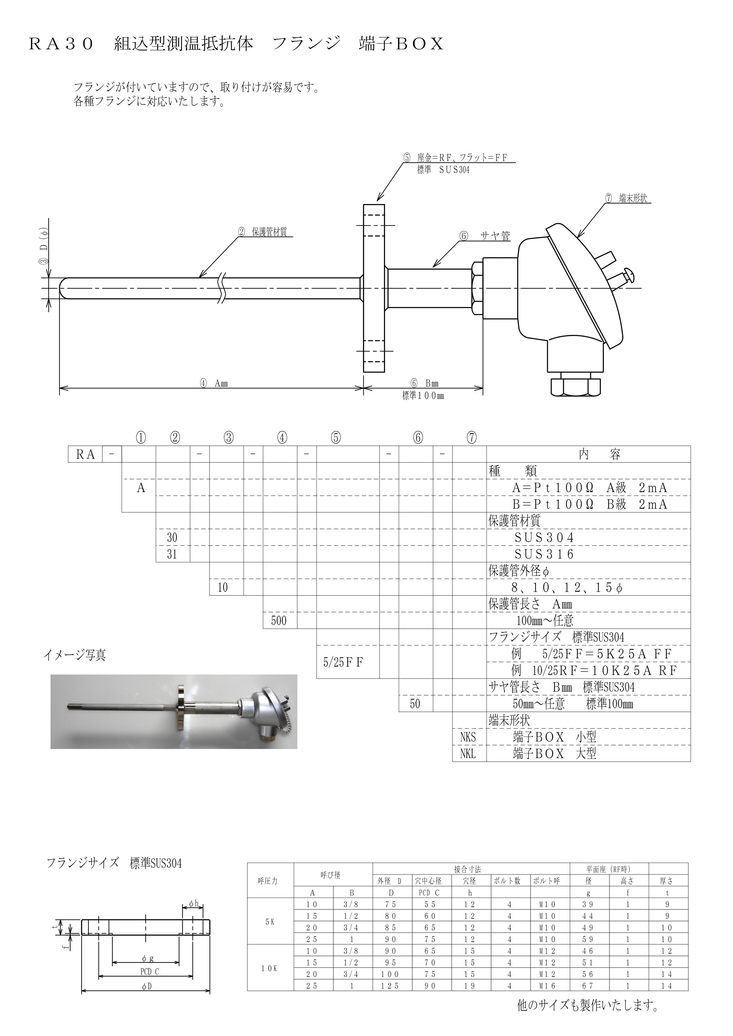 抵抗素子(マイカー素子)に内部導線を接続し、金属保護管等などに組み込んだ一般的な測温抵抗体です。 ストレート、固定ネジ付、フランジ付がありますので、用途により選択してください。